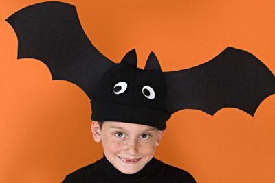 Potrzebne będą: czarny, sztywny filc, szablon skrzydeł nietoperza, kawałek białego filcu, czarna czapka, klej do tkanin, nożyczki, klamerki do bielizny.