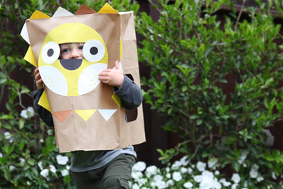 Potrzebne tylko będą duże torby z szarego papieru i kolorowy papier do ich ozdobienia, a także nożyczki i klej.